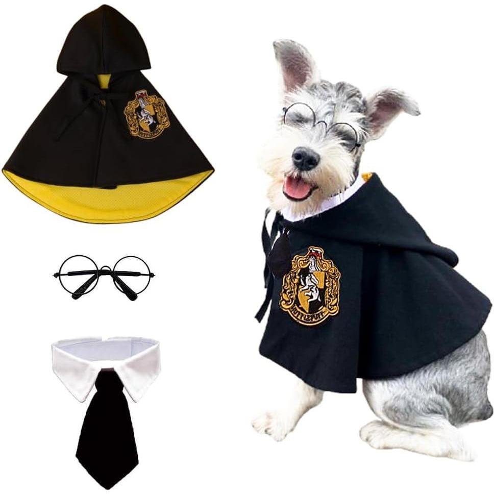 【Halloween pet magician costume set】: 3pcs Halloween dog cat outfit in package, 1*pet wizard costume+1*glasses for cats dog+1* black dog tie, very cool dog magician cosplay dress set and make your pet looks like a witch for learning magic