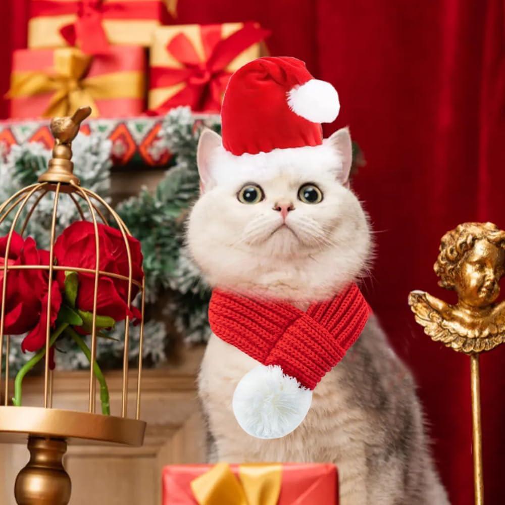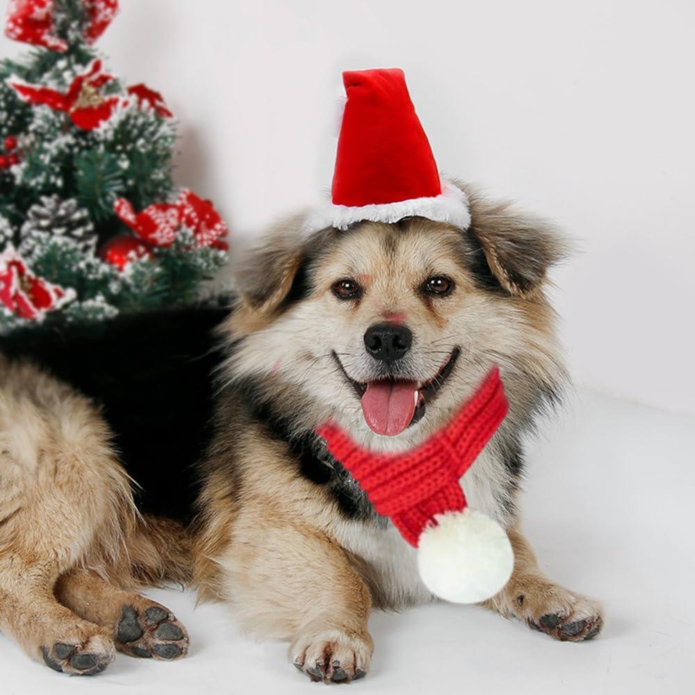 ANIAC Cat Santa Hat with Scarf Dog Xmas Cap Puppy Christmas Costume Pet Warm Headgear Doggy Neck Accessories for Cats and Small Dogs(Small)(Red)